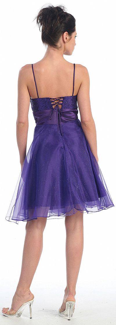 Sequined bodice formal prom dress with satin ruffles. This spaghetti strap short dress has glittered mesh skirt.