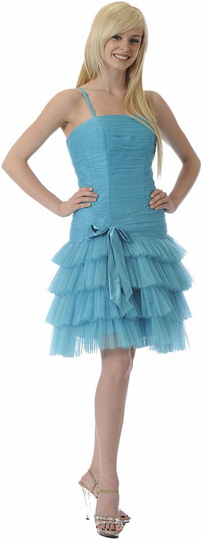 Spaghetti strapped formal party dress with satin bow on the side. Skirt has cascading ruffles of english net.