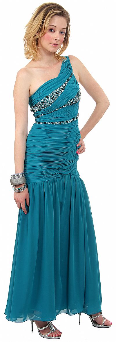 Long formal dress has one shoulder strap with diagonally ruched bodice with sections of sequins running through it. Dress has a tight fit and a flared skirt at the bottom. Dress has an open back with crossed straps. Back zipper closure. Made in the USA. (Model wearing TEAL is 5 ft -11 in.)