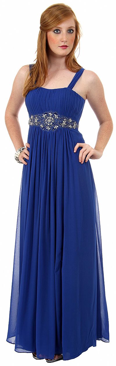 A classic Empire style Formal dress with ruched bodice,waistline accentuated with stone beading which extends all the way to the back of the dress.The broad straps of the dress can be opened into cap sleeves for a different look. 100% Polyester Chiffon.Imported.
