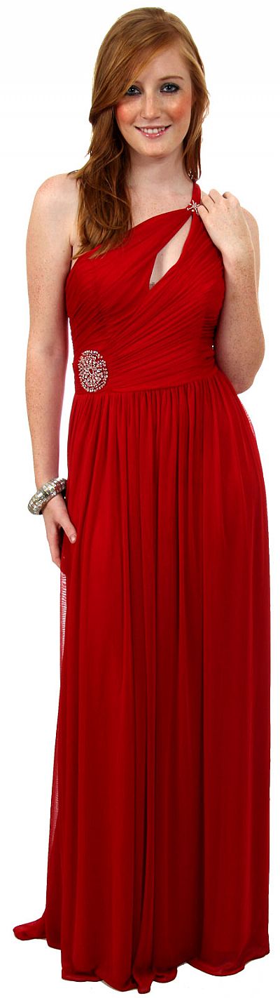 Elegant one shoulder formal prom dress with shirred bodice. Dress has a keyhole in the front pointing towards the shoulder ending with a brooch accent. Sequined floral patch on the side waist accentuates this formal dress. 100% Polyester. Imported.
