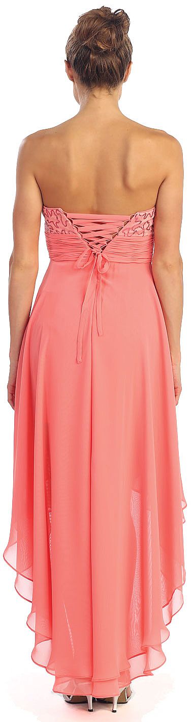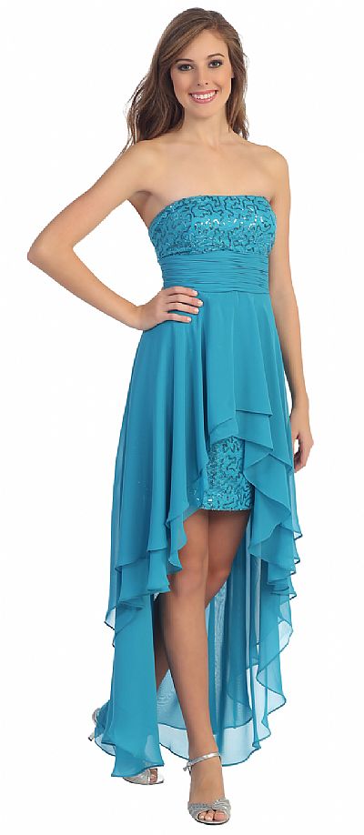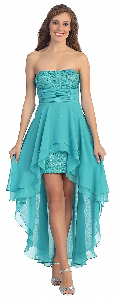 Beautiful High-low Prom Cocktail Dress with Double Layered Skirt over Sequined Dress. Strapless sequined short dress under double layered poly chiffon skirt attached at waist. The waistband is ruched, A-shape skirt is shorter in the front and floor length at the back. Imported.