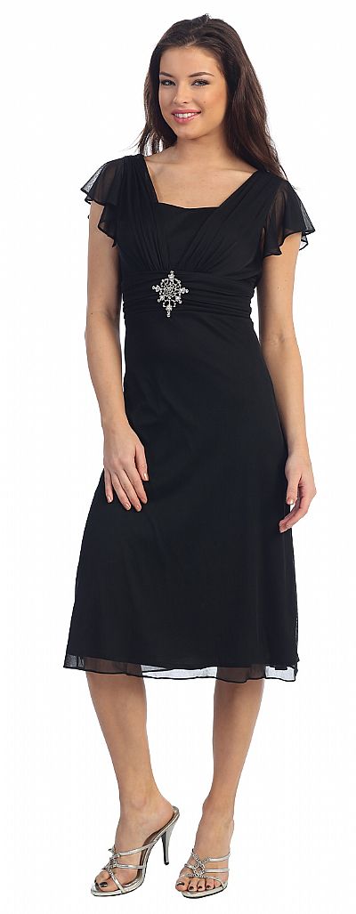 Medium Length Formal Cocktail Dress with Frilly Sleeves. Layered look at the bust with a brooch on the ruched waistline. Bust is also little ruched. Back zipper closure. Imported.