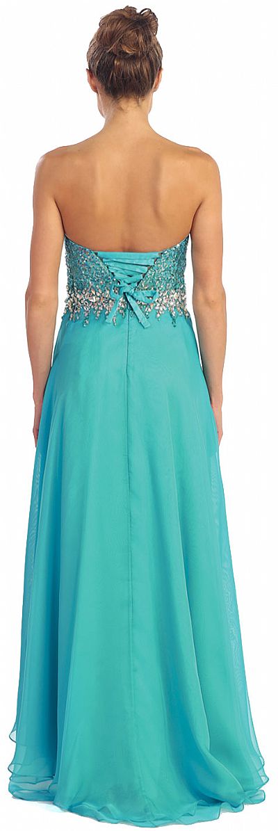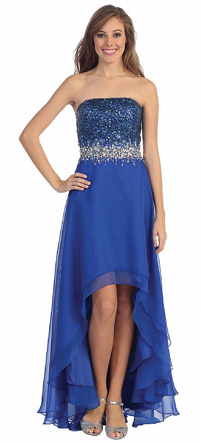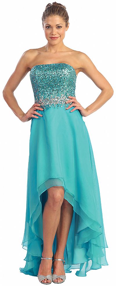 | STRAPLESS HI-LOW FORMAL PROM DRESS WITH SEQUIN BODICE (item #p8608)