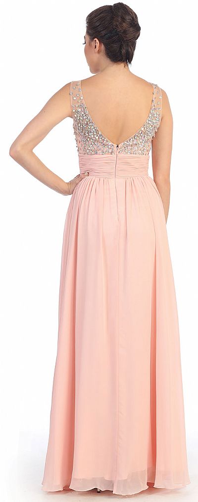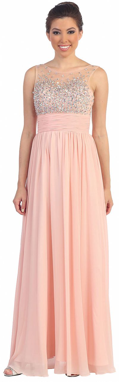 Bejeweled Mesh Top Long Formal Prom Dress. Sleeveless sheer mesh top has rhinestones all over it in varied sizes. Ruched broad waistband with flared chiffon skirt. V-shape sheer mesh back with rhinestones & zipper closure also. Imported.