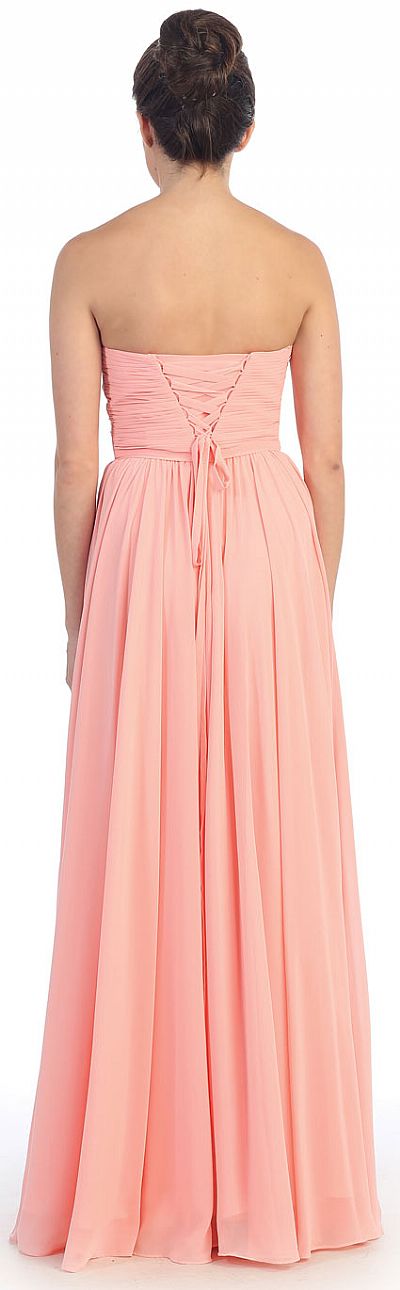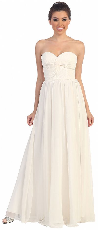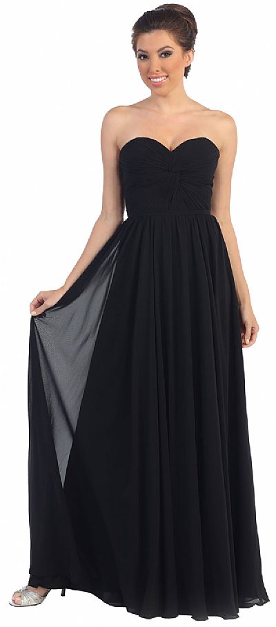 Strapless Twist Knot Bodice Floor Length Formal Prom Dress. Empire cut ruched bodice has a twisted knot design with thin belt accent below the bust. Bustier style back straps with zipper closure also. Bust is padded. Polyester chiffon dress. Imported.