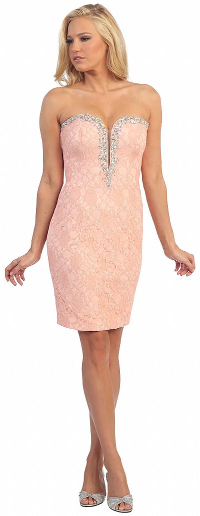 Bejeweled Bust Strapless Short Prom Party Dress In Lace. Deep V-Neck in the middle of bust has sheer mesh. Rhinestones decorate the bust & make a deep v-neck on the bodice of this floral pattern lace dress. Bustier style back straps in satin fabric with zipper closure also. Imported.