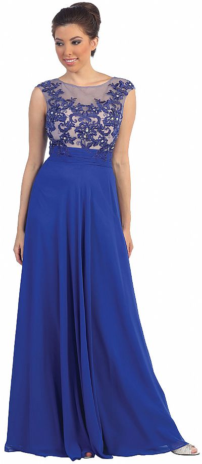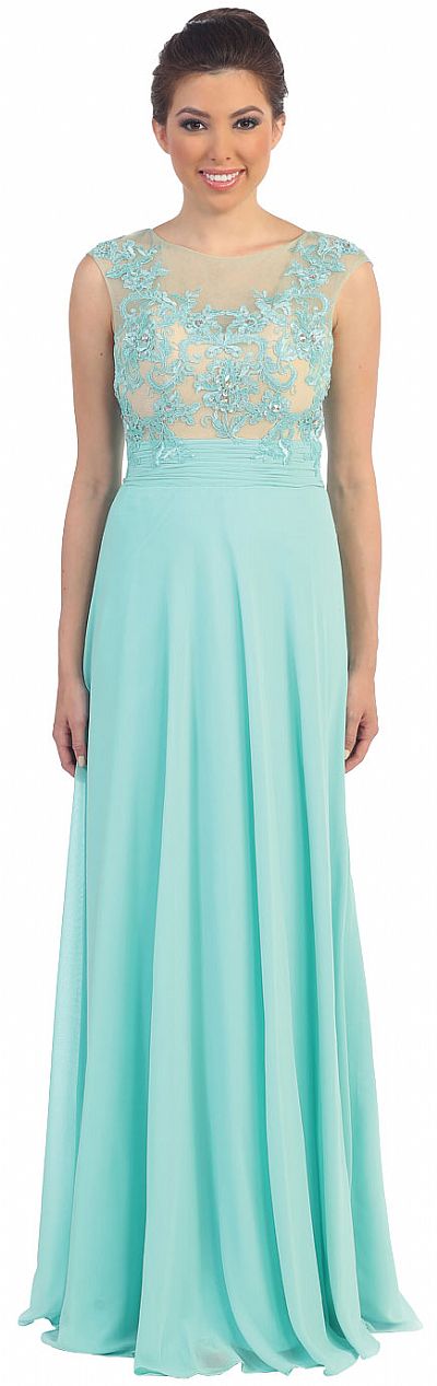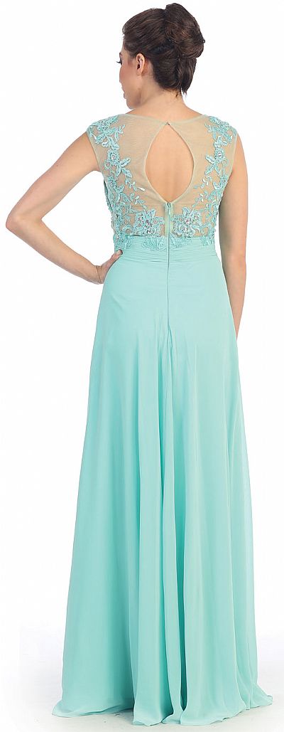 Mesh Floral Bust Keyhole Back Long Formal Prom Dress. Sheer mesh bust is decorated with floral embroidery all around with rhinestones also and solid gold color inner. Sleeveless dress has sheer back with keyhole & back zipper closure also. Ruched waistband all around with flowing chiffon skirt. Imported.