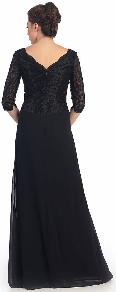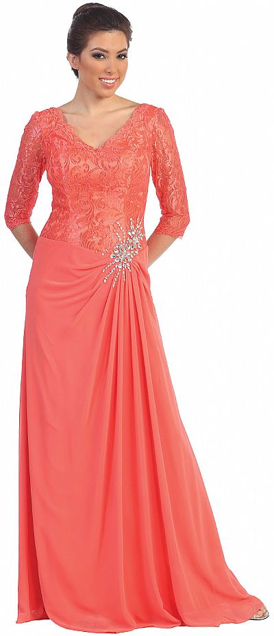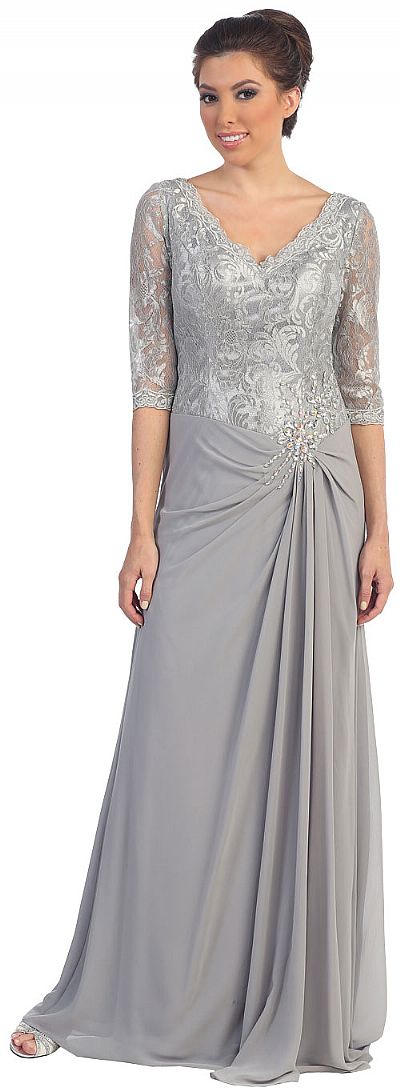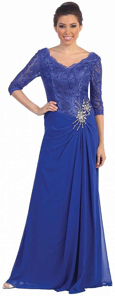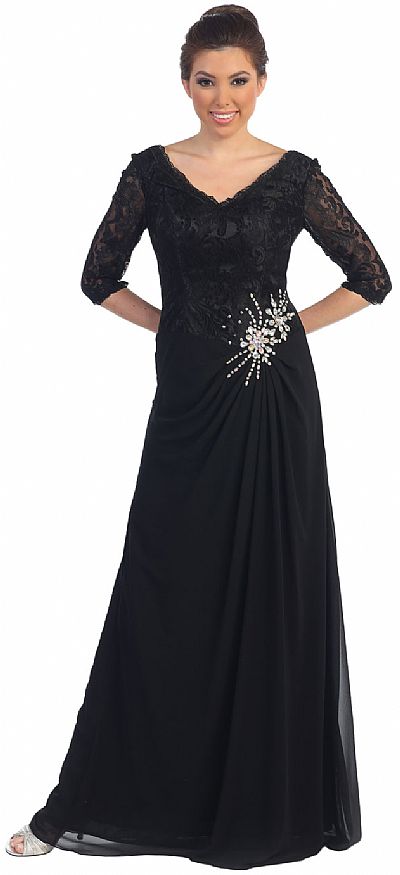 V-Neck Half Sleeves Lace Top Long Formal Mother of the Bride Dress. Bodice is made of floral pattern lace & also the 3/4 sheer sleeves. Polyester chiffon skirt is gathered & pleated on one side of waist with rhinestones in floral pattern over it. V-shape back also with zipper closure. Imported.