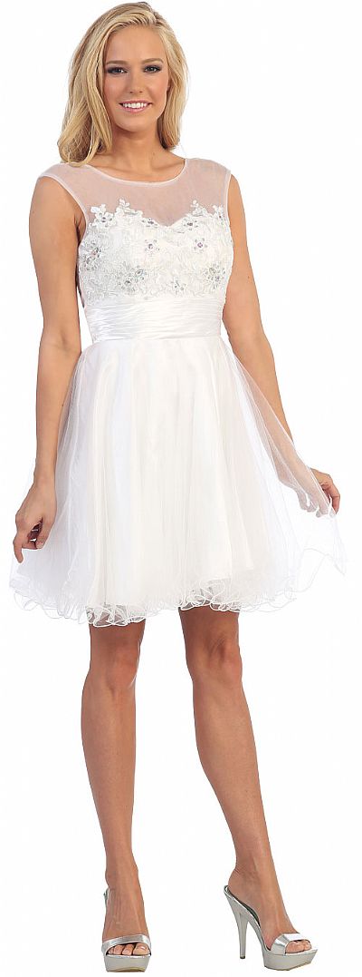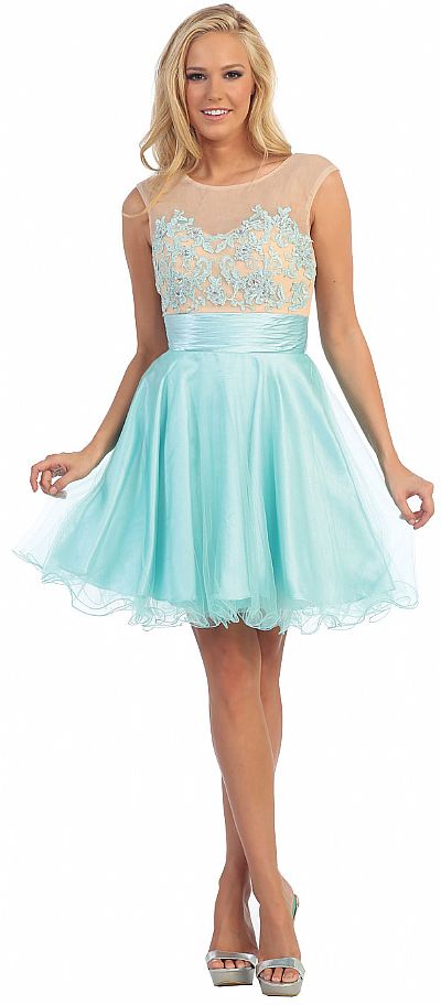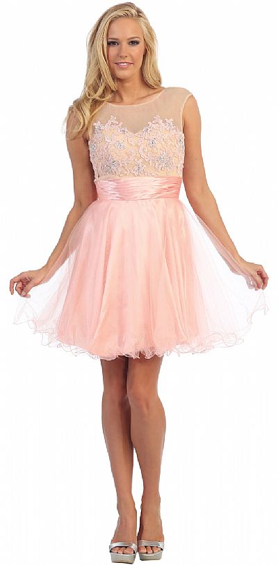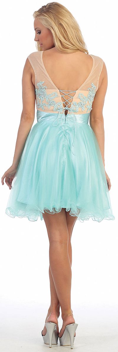 Round Neck Floral Bust Tulle Short Party Prom Dress. Mesh bust is decorated with floral applique all over with rhinestones also. Sleeveless dress has sheer mesh at neckline all around with satin ruched waistband. Multiple layers of tulle at the skirt with ruffled hem. Bustier like back straps with zipper closure also. Imported.
