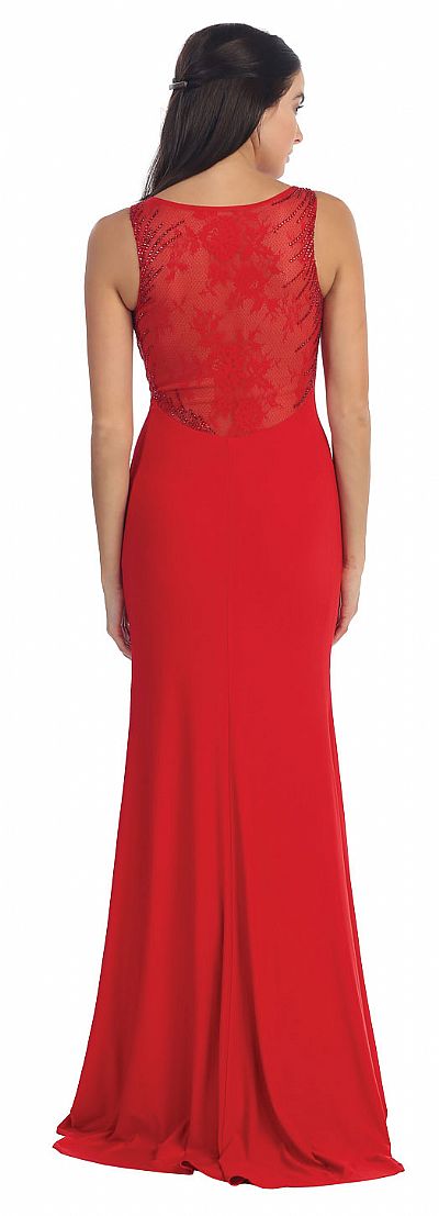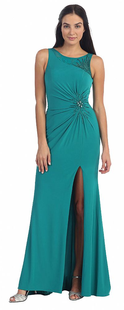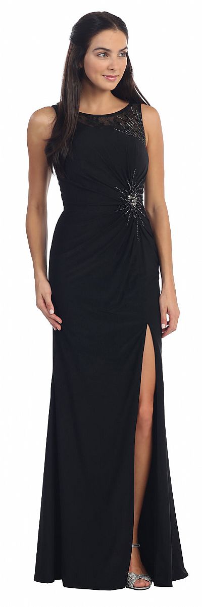 Sleeveless Beaded Waist Front Slit Long Formal Prom Dress. Round neck dress has sheer lace at one side of neckline & back also. Skirt is gathered on the waist embellished with beads & stones. Beading also on the shoulder & back also. Flared skirt has slit on one side with side zip closure. Imported.