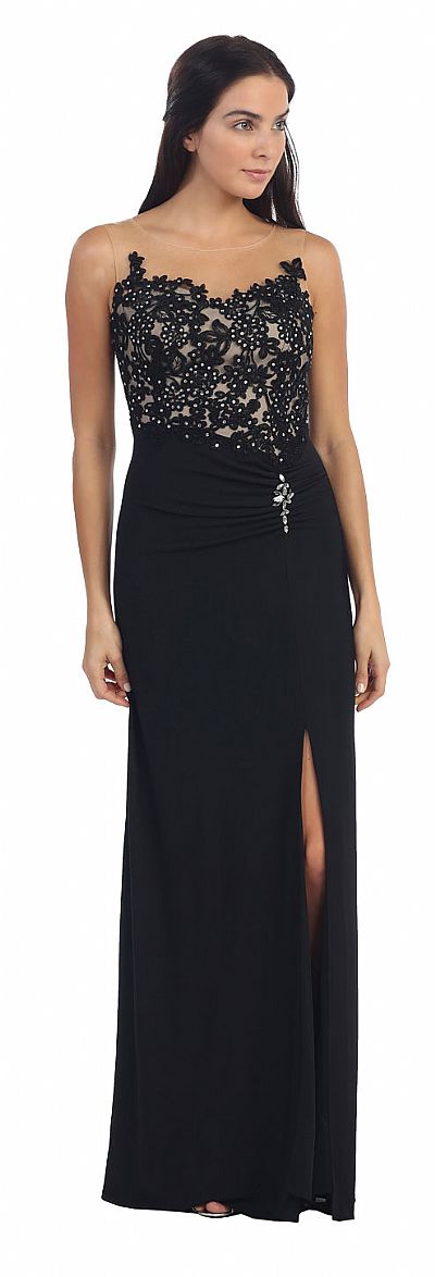 Sleeveless Floral Lace Bust Front Slit Long Formal Prom Dress. Floral pattern lace at the bodice embellished with rhinestones also & nude mesh under it. Sheer mesh at the neckline in front & back with . Shirred waist with rhinestones on one side of it. Front slit adds that oomph to this formal dress. Back zipper closure. Imported.
