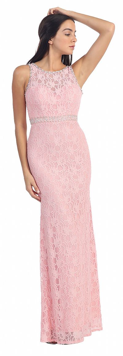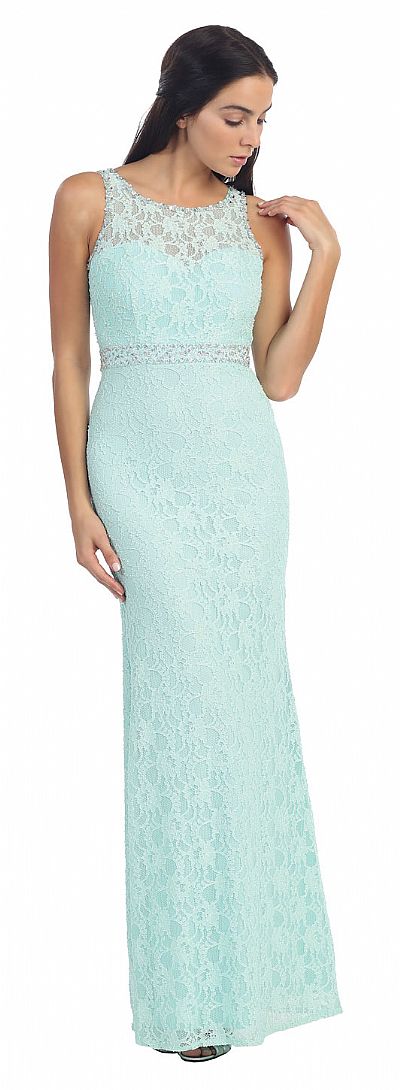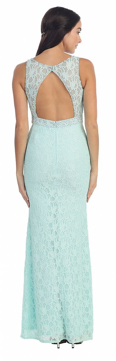Floral Lace Beaded Long Formal Prom Dress with Keyhole Back. Sleeveless dress has rhinestones decorating the round neck & shoulders at front & back and also the big keyhole at the back. Beaded waistline with little flared skirt. Sheer lace at the neckline & back. Back zipper closure. Imported.