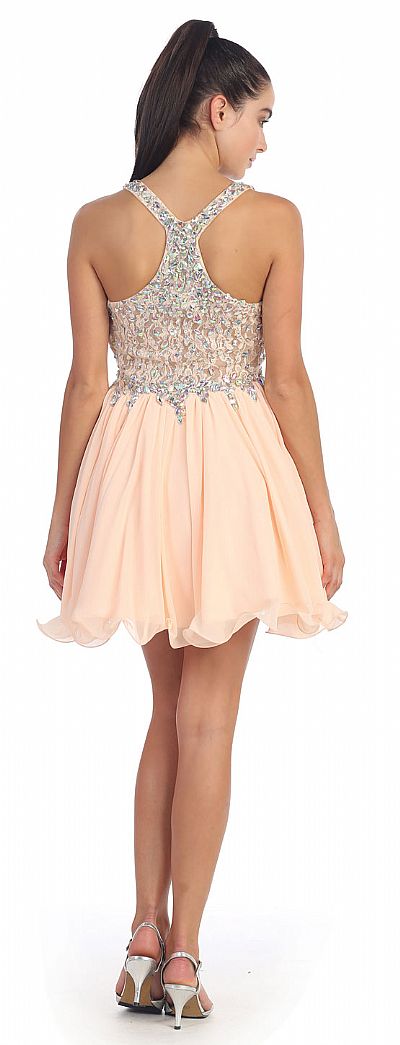 | V-NECK RACER BACK RHINESTONES BUST SHORT FORMAL PROM DRESS (item #p8997)