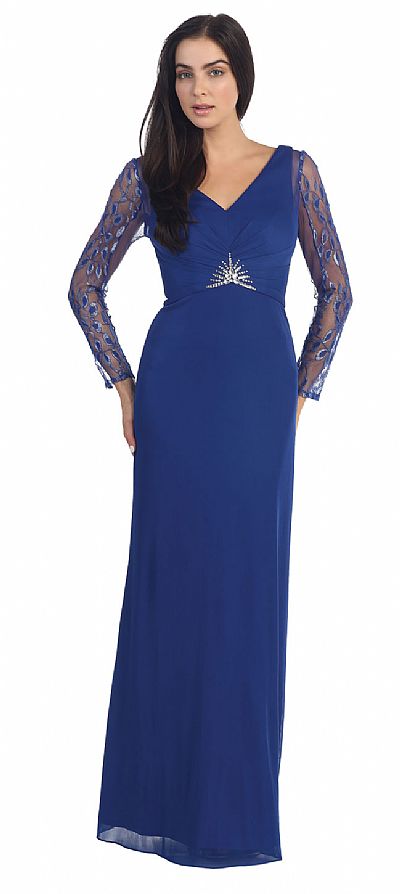 V-Neck Full Sleeves Long Formal Mother of the Bride Dress. Little shirring at bust with rhinestones patch & also shirring at the back. Long mesh patterned sleeves with little flared skirt. V-neck back also with zipper closure. Imported.