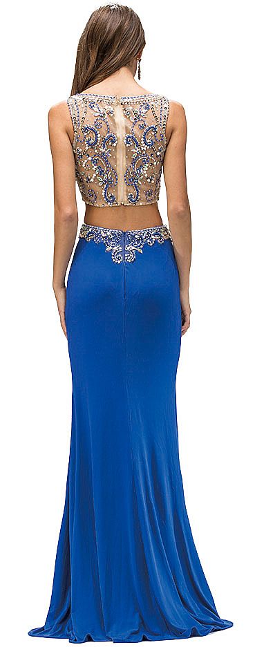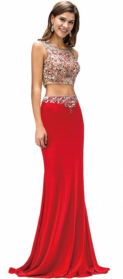 Bejeweled Top Long Jersey Skirt Two Piece Prom Dress. Boat neck sheer mesh top is embellished with rhinestones, beads & sequins having bra cups. Beaded at waist floor length jersey skirt with back zipper closure & top has zipper closure too. Top is 13" long & skirt is 45". Imported.