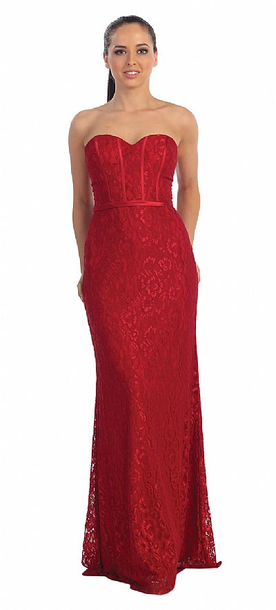 Strapless Sweetheart Neck Long Lace Formal Bridesmaid Dress. Floral pattern lace dress with sweetheart neckline and boning like design & belt at waist in satin. Flared skirt with corset like back straps & zipper closure too. 100% polyester. Imported.