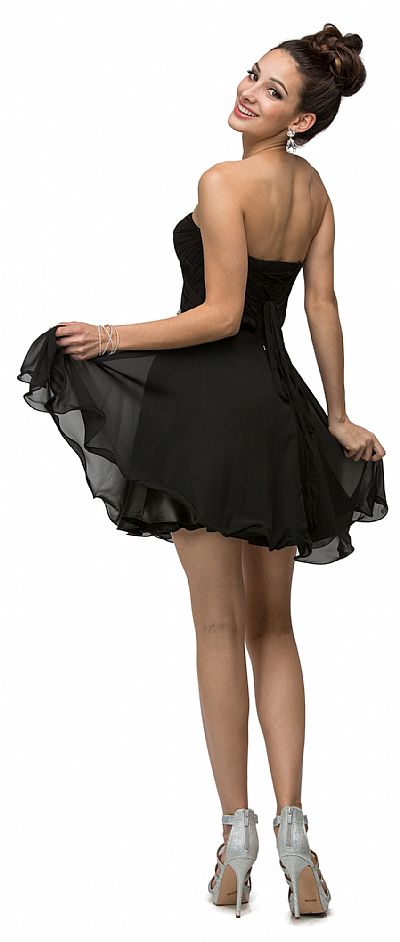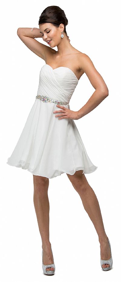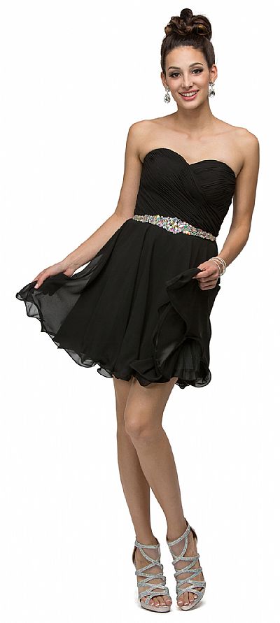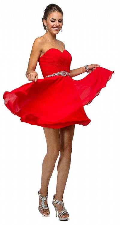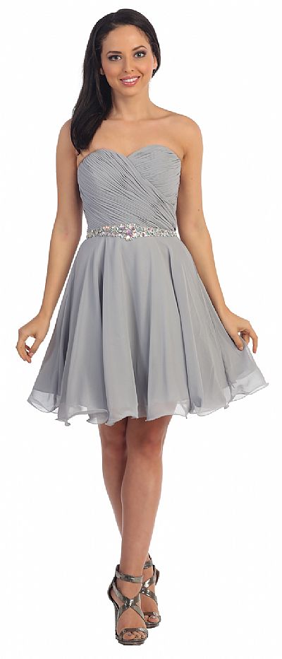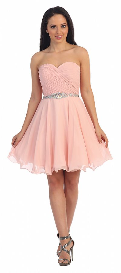 Strapless Ruched Bust Short Homecoming Bridesmaid Dress. Ruched overlap style sweetheart bodice with jewel encrusted belt at waist. Skirt is full and flirty with layers of chiffon that adds to the playful mood. 32" long dress has corset like back straps. Polyester chiffon, imported.
