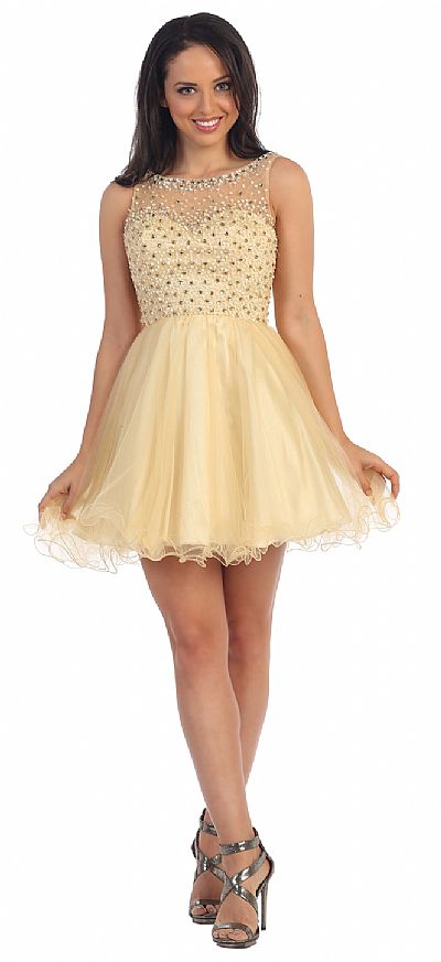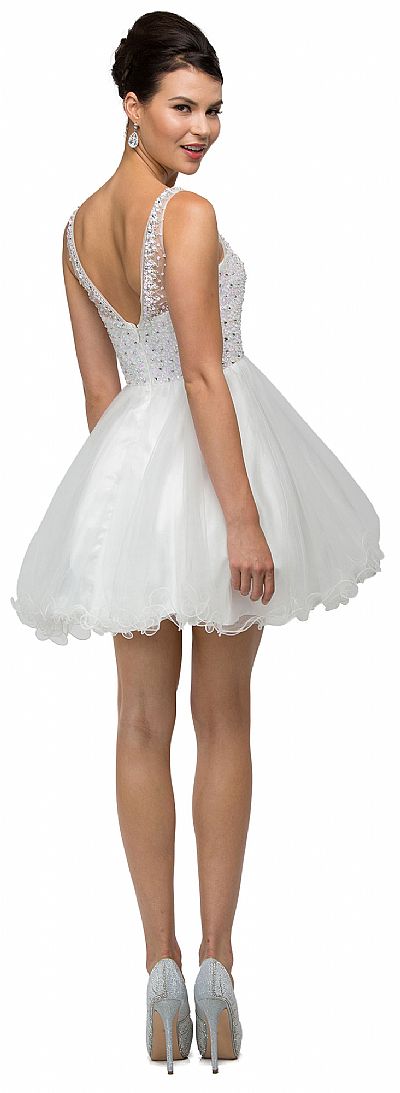 Bateau Neck Bejeweled Bust Short Babydoll Homecoming Party Dress. Boat shape sheer neckline has beads outlining it with encrusted jewels all over the bodice. Layers of tulle with ruffled hem at the skirt gives fun & chic look to the dress. 32" long dress has bra cups & v-shape back with zipper closure. Imported.
