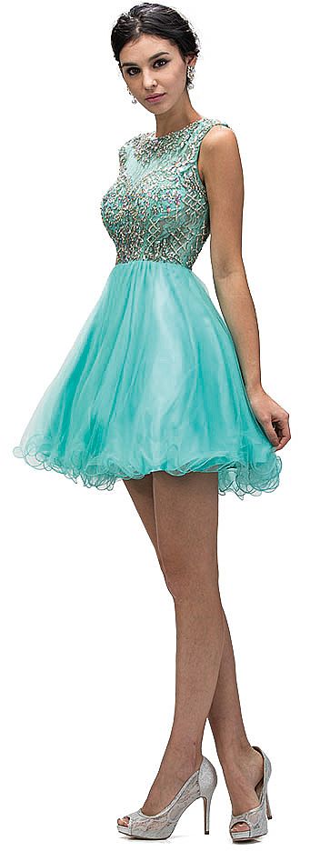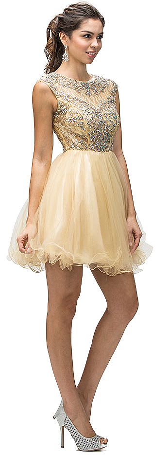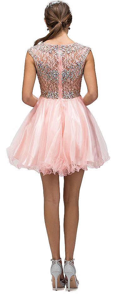 Bejeweled Mesh Bodice Cap Sleeves Short Baby Doll Dress. High neck jewel encrusted mesh bodice has cap sleeves & flowing layered mesh skirt. Equally sparkling sheer beaded lace at the closed back too with zipper closure. 32" long polyester dress has bra cups too. Imported.