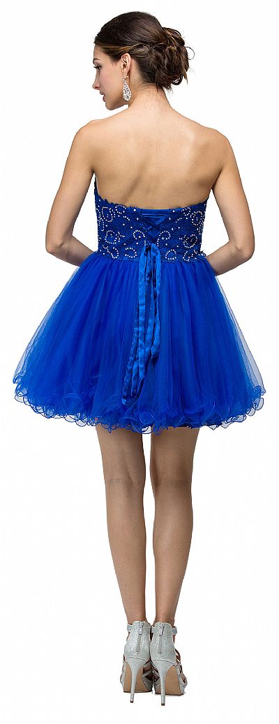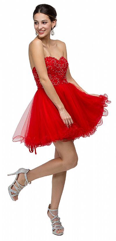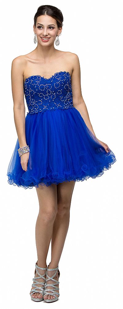 Strapless Beaded Lace Mesh Short Homecoming Party Dress. Sweetheart neck dress has floral lace embroidered with miniature rhinestones. Fit & flare dress has muliple layers of tulle at skirt with ruffled hem. Lace up back with zipper closure too. Imported.