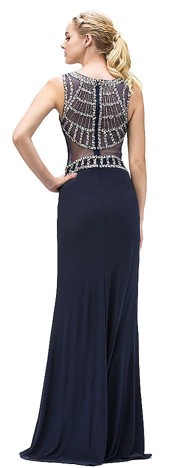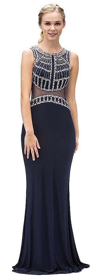Bejeweled Top Sheer Waist Floor length Prom Dress. High round neck top is embellished with rhinestones in varied sizes making a boxy pattern. Sleeveless jersey dress has sheer waist and back with closed back having zipper closure. Imported.