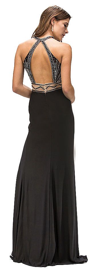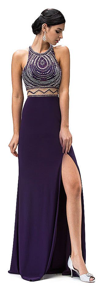 Sleeveless Beaded Top High Neck Long Formal Prom Dress. High round neck bodice has beads making a circular pattern with sheer mesh waistband. Front side slit on 60" long jersey dress with bra cups too. Sleeveless open back dress has hook closure at back of neck & zipper closure at skirt too. Imported.