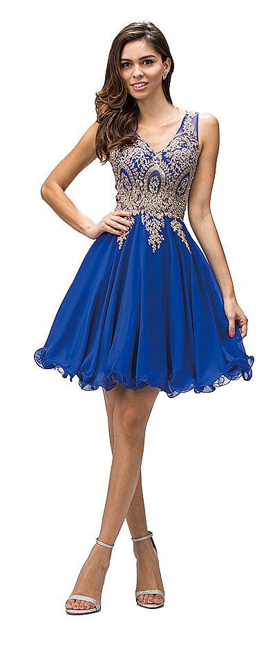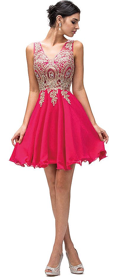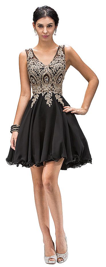 Sleeveless Embroidered Bodice Short Homecoming Party Dress. Sheer mesh bodice has an alluring pattern in metallic brocade lace cascading onto the skirt. V-neck dress has baby doll style ruffled hem chiffon skirt with bra cups. 34" long dress has v-shape back with zipper closure. Imported.