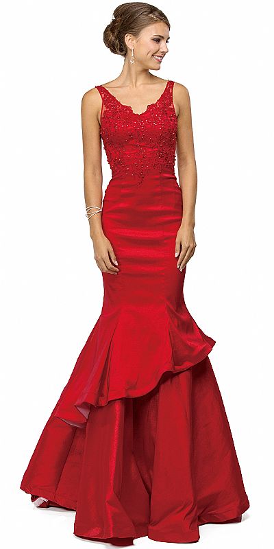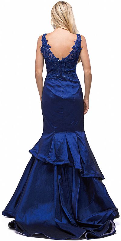 V-neck Lace Bodice Layered Skirt Formal Long Prom Dress. Jewel like tiny beads scatter over the lace bodice with a mid-low v-back. 63" long formal gown has a long train and a flirtatious asymmetrical ruffle on the long mermaid skirt. Bra cups with back zipper closure also. Imported.