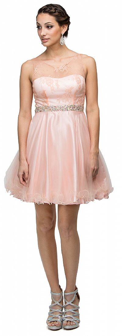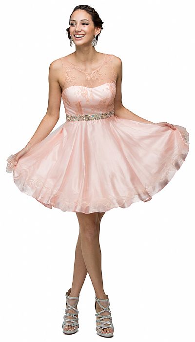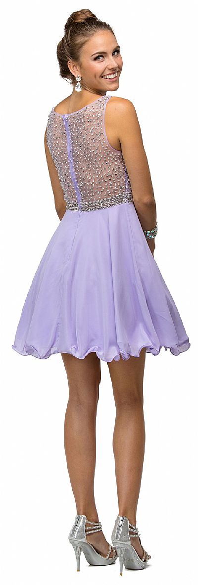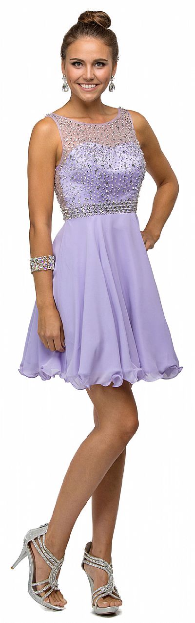 Sparkling Jewels Bodice Short Homecoming Party Dress. Boat neck sheer mesh overlay embellished with sparkling sequins & rhinestones over illusion sweetheart neck. A-line ruffled hem chiffon skirt with sheer back having zipper closure & bra cups too. Polyester chiffon 34" long dress is imported.