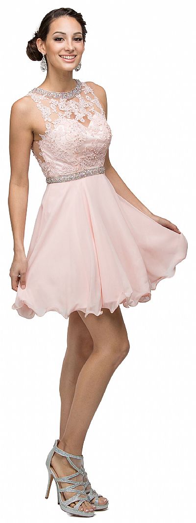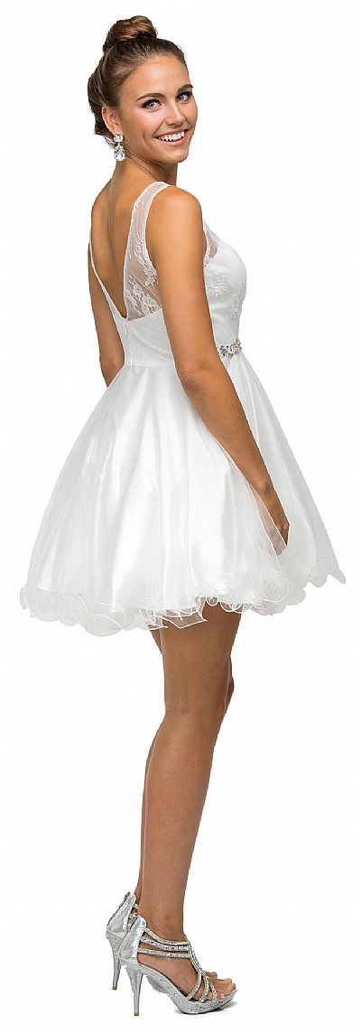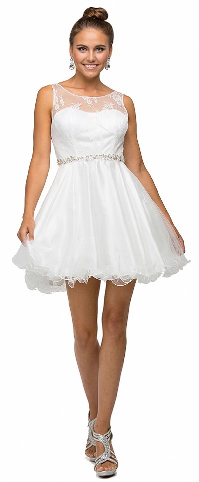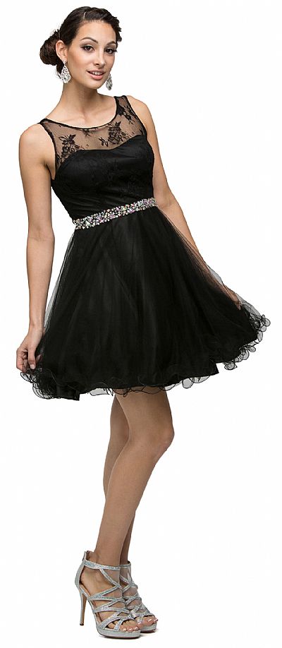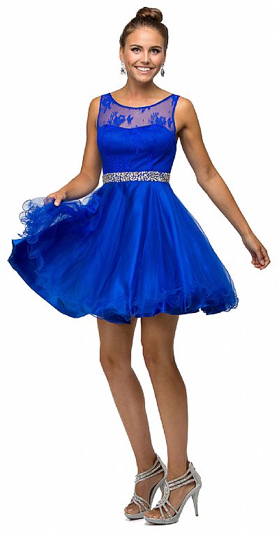 Illusion Sweetheart Neck Short Tulle Homecoming Party Dress. Sleeveless dress has floral lace bodice with illusion sweetheart neckline. Jeweled waistband with layered tulle skirt with ruffled hem. 33" long dress has bra cups & mid low v-shape back with zipper closure. Imported.
