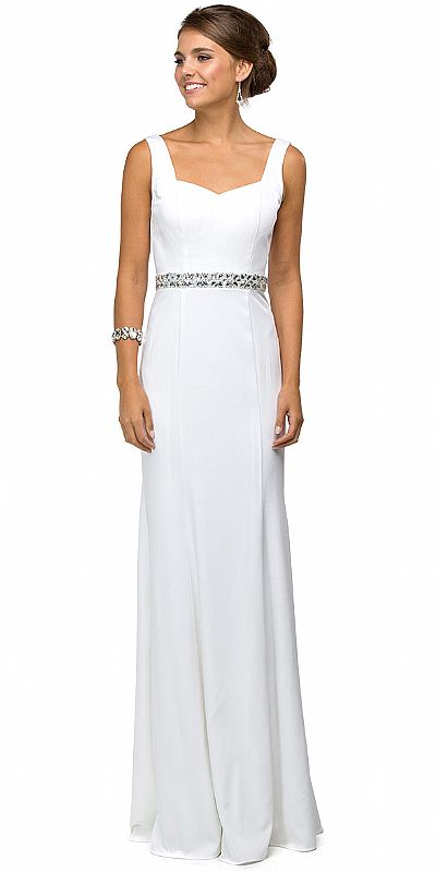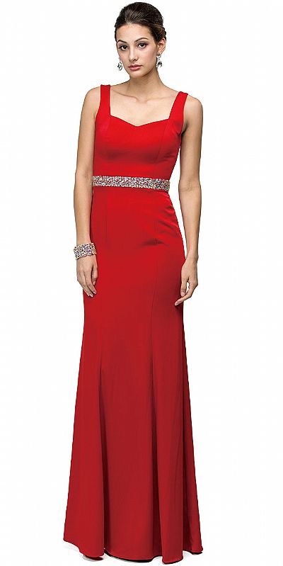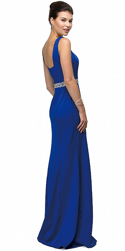 Wide V-Neck Beaded Waist Long Formal Prom Dress. Sleeveless dress has subtle v-neck with square neckline at the back. Rhinestones make an endearing pattern waistband on this 61" long polyester satin dress. Flared bottom on the skirt with built-in bra cups & back zipper closure too. Imported.