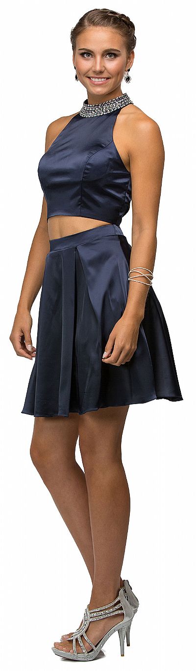 Jeweled Collar Two Piece Short Homecoming Party Dress. High neck 15" long top has bejeweled collar with bra cups too. 19" long skirt has box pleats which adds flare to it. Hook & zipper closure on back of the top & zipper closure on skirt. Imported.