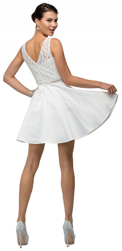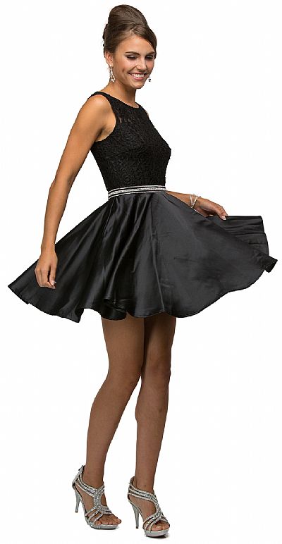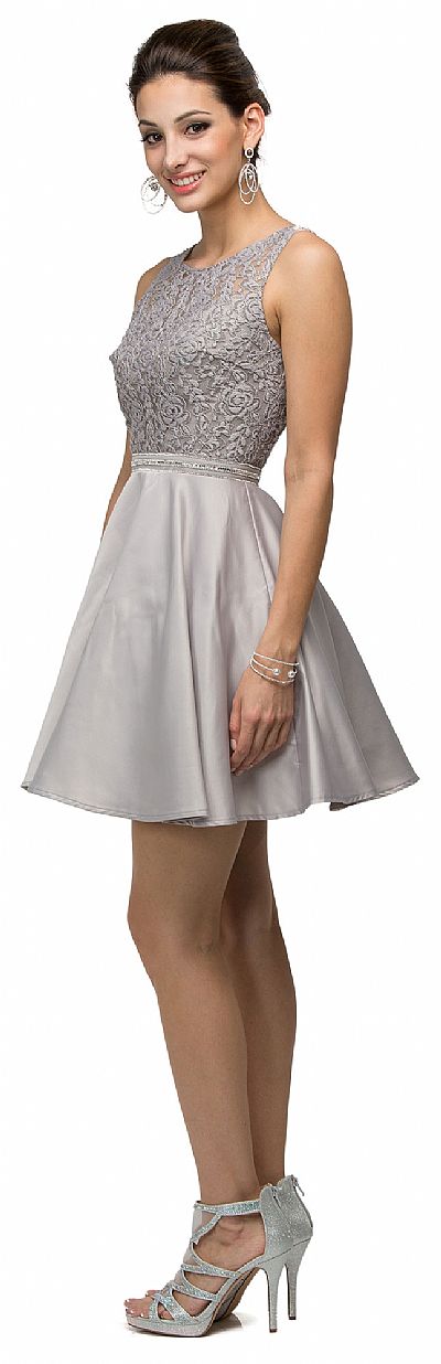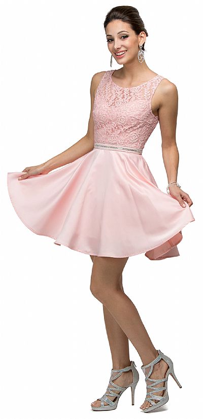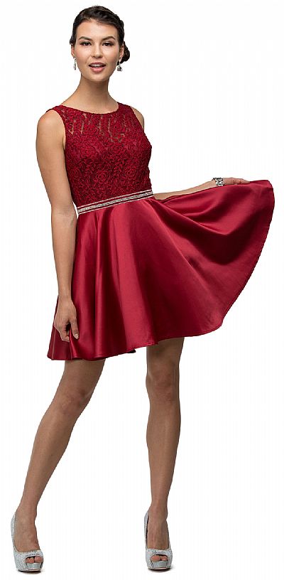 Lace Bodice Beaded Waist Short Homecoming Graduation Dress. Round neck dress has floral lace overlay at the bodice with beaded waistband. Flared polyester satin skirt of 33" long dress having v-shape back with zipper closure. Imported.