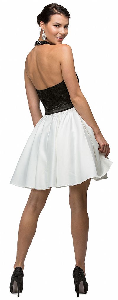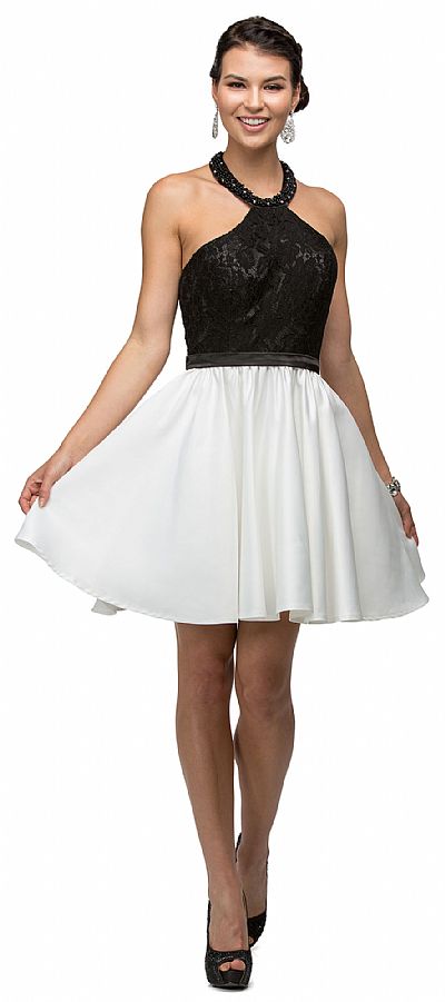 Halter Lace Top Beaded Neck Short Homecoming Party Dress. Floral lace top with beaded scoop neckline. Satin belt at waist with gathered polyester satin a-shape skirt. Bra cups included with this 35" long dress having back zipper closure. Imported.