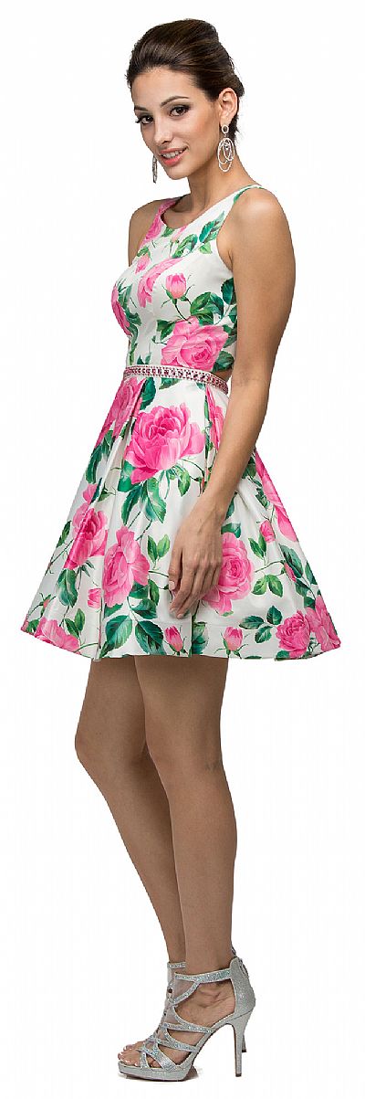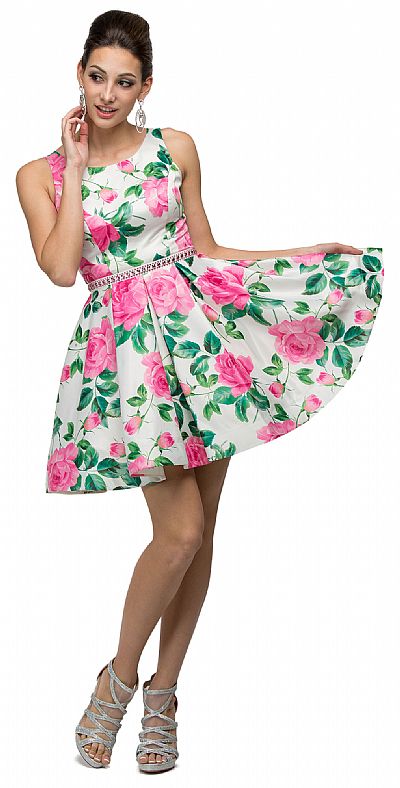 Floral Print Cut-Out Back Sleeveless Short Homecoming Dress. Scoop neck dress has jewels accenting the waist with broad pleats skirt. cut-outs at back with hook closure & zipper closure on skirt. 33" long polyester satin dress has built-in bra cups. Imported.