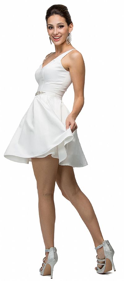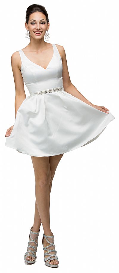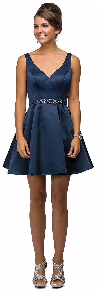 V-Neck Fit & Flare Short Homecoming Party Dress. Sleeveless dress has v-neck with jeweled waistband & lightly pleated skirt which adds flare to the dress. Bra cups included with 34" long v-shape back dress having zipper closure. Imported.