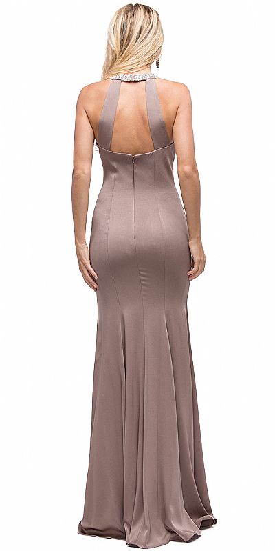 | JEWELED COLLAR CUT OUT BACK LONG JERSEY PROM DRESS (item #p9708)