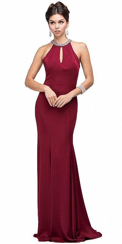 Jeweled Collar Cut Out Back Long Jersey Prom Dress. Rhinestones like beads decorate the round collar with a keyhole below that. Fitted at the bodice & flared at the bottom polyester jersey dress has a cut-out back with hook & zipper closure. 62" long dress has built-in bra cups too. Imported.