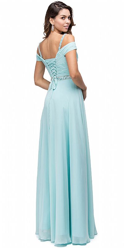Cold Shoulder Beaded Waist Long Bridesmaid Prom Dress. Sweetheart neck bodice which is ruched and twisted & also has ruched off-the-shoulder sleeves that lay gently over the arms. Beaded shoulder straps providing style and support with shimmering sequins encircling the waist. Corset back laces up for a classic style on this 60" long polyester chiffon dress. Imported.
