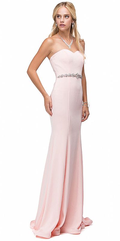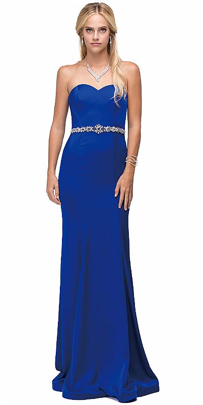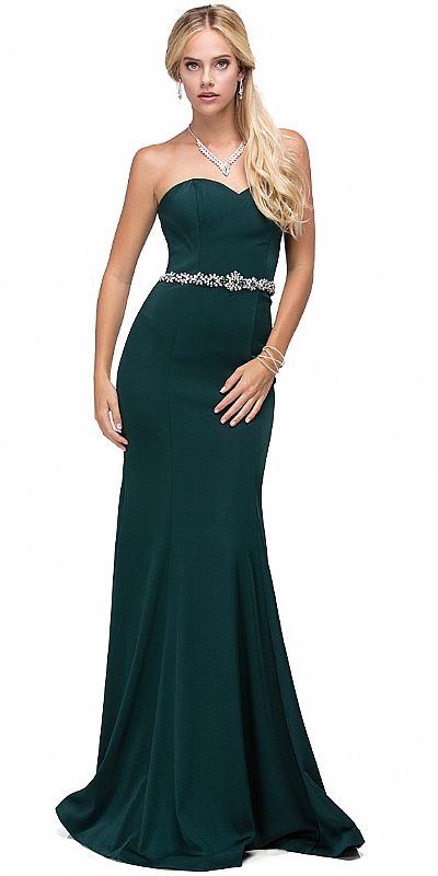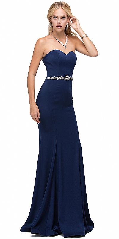 Strapless Rhinestones Waist Long Jersey Prom Dress. Sweetheart neck stretchy jersey fabric dress has rhinestones adorning the waist in a floral pattern. 57" long dress is fitted around the hips with flared bottom gives a mermaid look to the skirt. Built-in bra cups with back zipper closure. Imported.