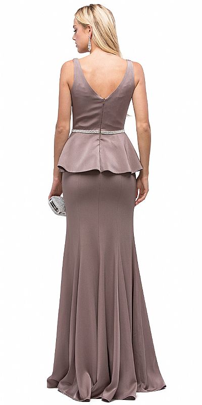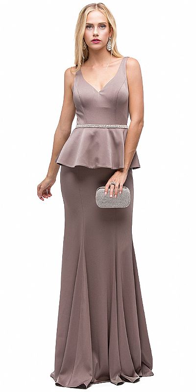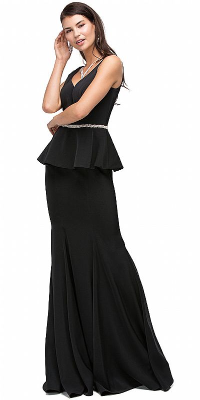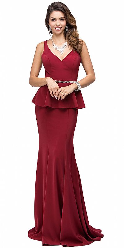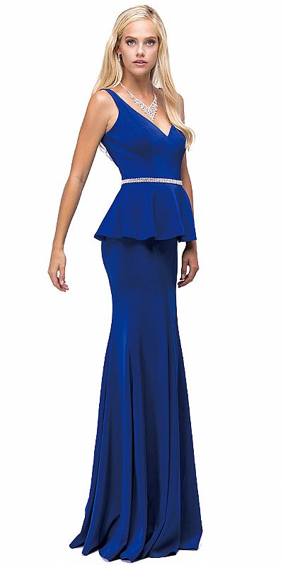 Deep V-Neck Peplum Bodice Long Formal Prom Dress. Peplum top drapes over the hips from the shimmering rhinestones waist detail. Sleeveless top has deep v-neck with bra cups. Flared bottom 62" long jersey dress has v-shape back with zipper closure. Imported.