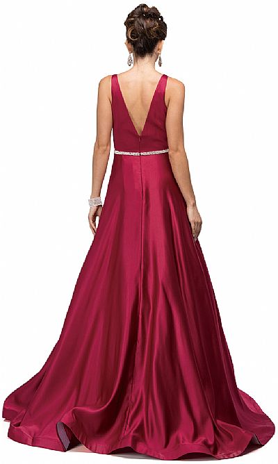 V-Neck Bejeweled Waist Floor Length Puffy Prom Pageant Dress. Sleeveless fitted top on poly satin dress with rhinestones belt on the waist. Puffy floor length skirt makes this dress suitable for any formal event like prom, quincenera, pageant etc. Deep v-shape back with zipper closure. Imported.