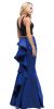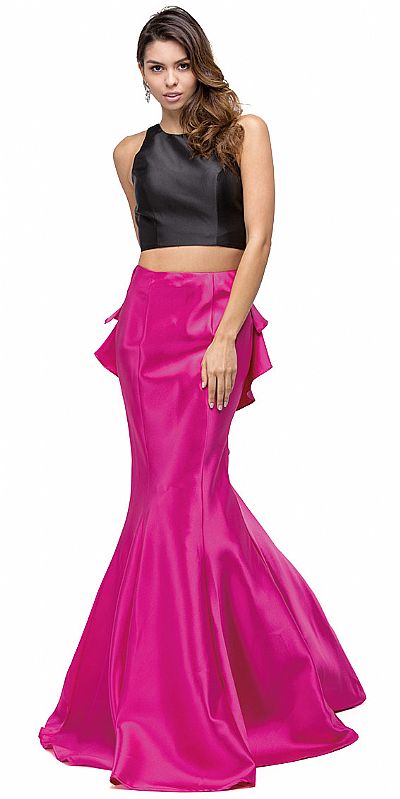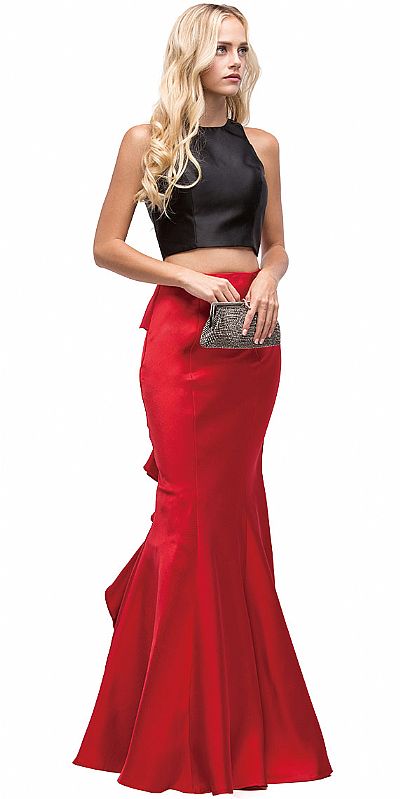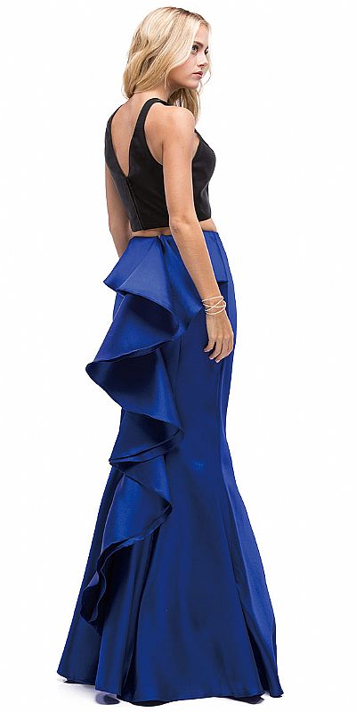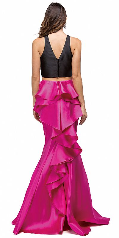 Short Black Top Long Ruffled Back Skirt Two Piece Prom Dress. Round neck sleeveless crop top in polyester taffeta with v-shape back. Fitted on the top & flared at the bottom skirt with ruffled fabric along its length at the back. Zipper closure on the back of the top & skirt too. Imported.