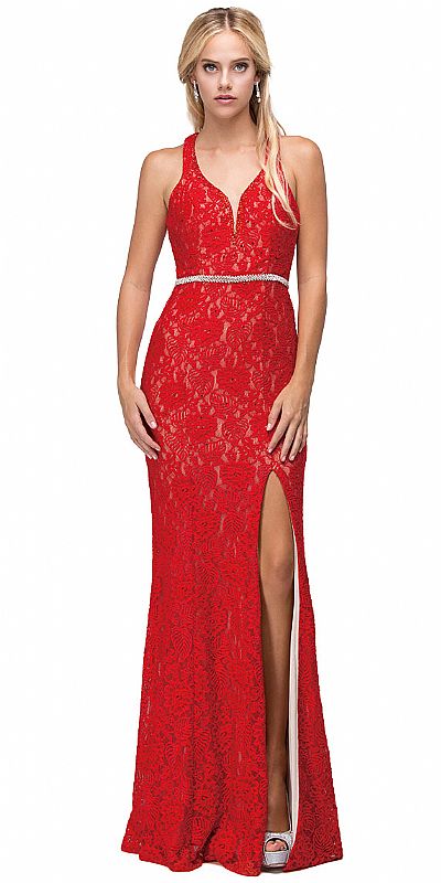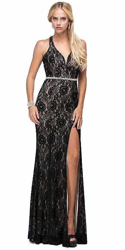 Deep V-Neck Rhinestones Waist Lace Long Prom Dress. Floral pattern lace dress with deep v-neck & rhinestones belt at the waist. Wide straps that criss-cross the shoulders at the back with zipper closure on the skirt. Thigh-high slit on the flared bottom skirt. Imported.