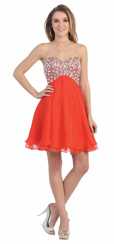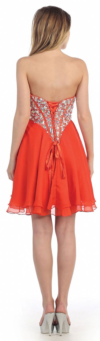 Strapless Bejeweled Bodice Short Party Prom Dress. Rhinestones in different shapes decorate the sweetheart neckline bust & also the back. Bustier style back straps on v-shape bejeweled back. Layered skirt dress is in polyester chiffon. Imported.