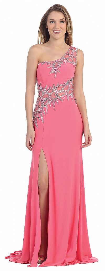 One Shoulder Web Beaded Pattern Long Prom Pageant Dress. Exquisite web like beads & sequins pattern on sheer fabric at neckline, diagonally at the waist & back also. Front slit at the dress which has little train at the back. Side zipper closure. Imported.