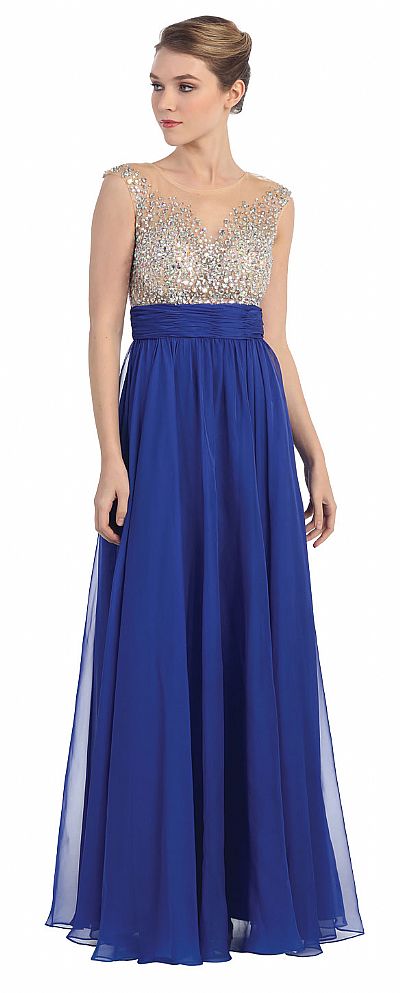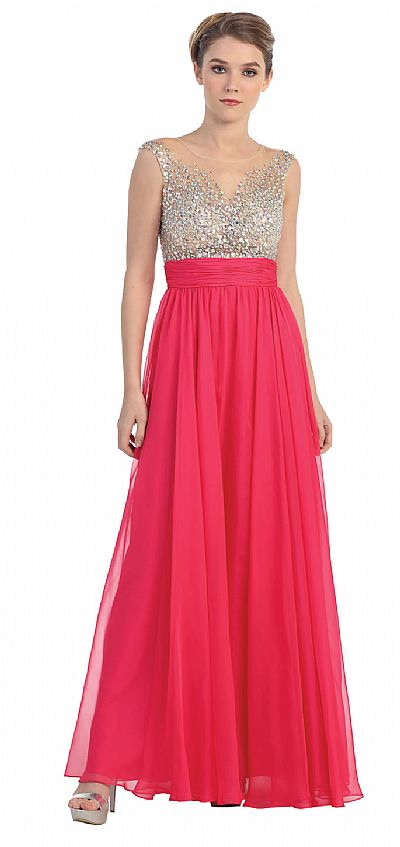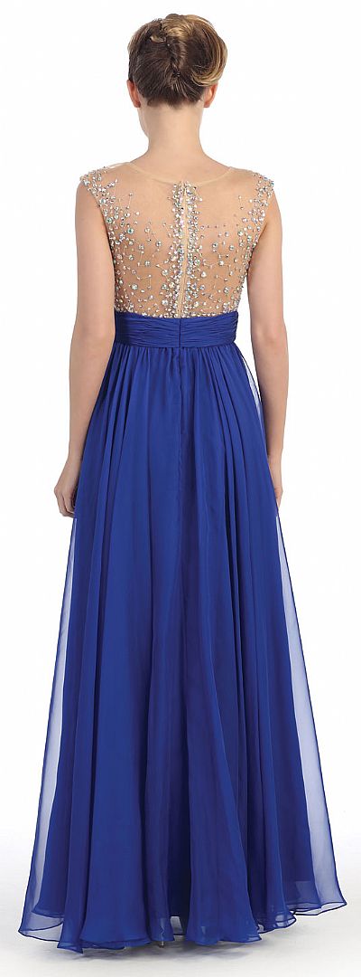 Sleeveless Bejeweled Mesh Bust Long Prom Pageant Dress. Jewels like rhinestones decorate the mesh bust all around & make a v-neck in the front. Sheer mesh neckline with padded bust, ruched waistband & flowing chiffon skirt. Mesh back is see-through, decorated with rhinestones & has zipper closure also. Imported.