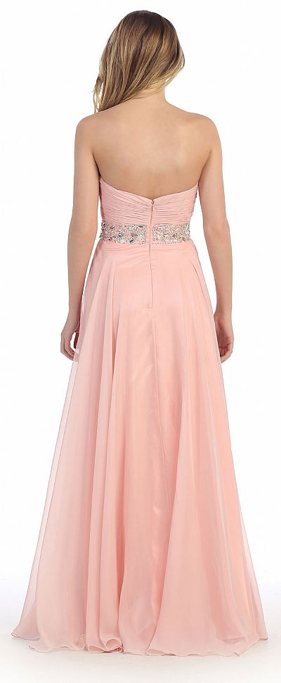Strapless Sequins Inner Skirt Long Formal Prom Dress. Empire cut shirred bust with twist knot & a-shape rhinestones waistband. Inner layer at skirt has big sequins all over with sheer outer layer having front slit. Back zipper closure on floor length dress. Imported.