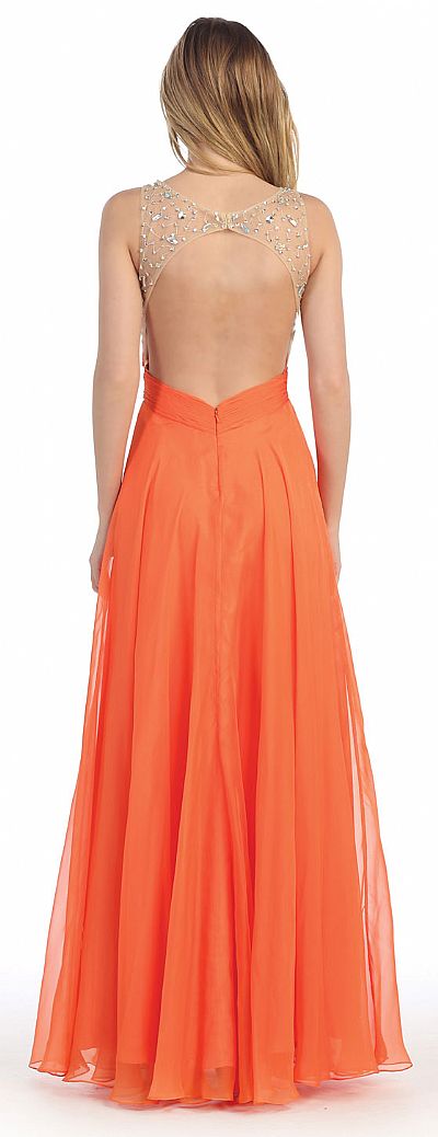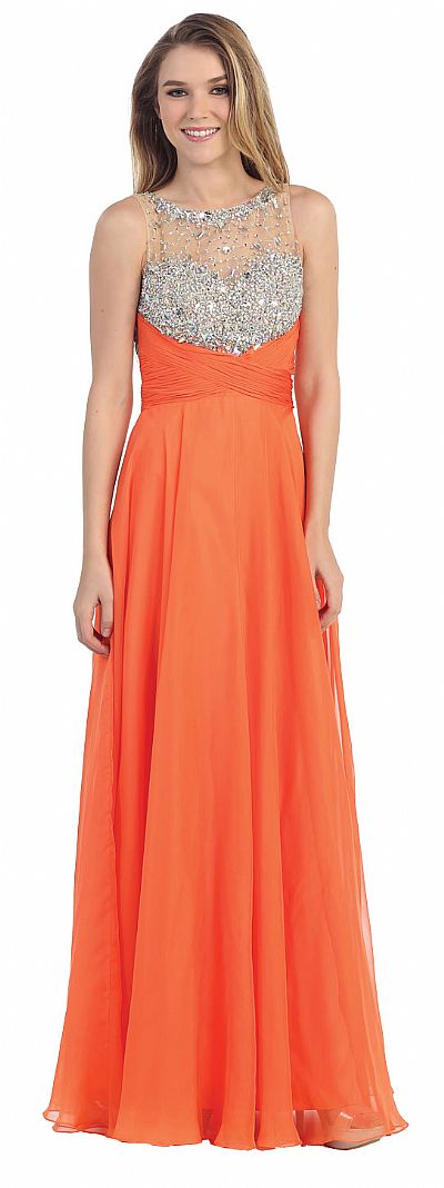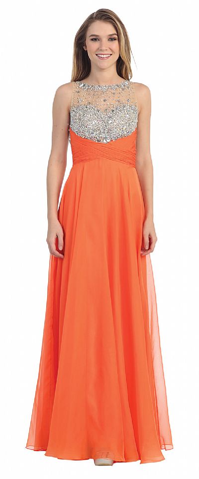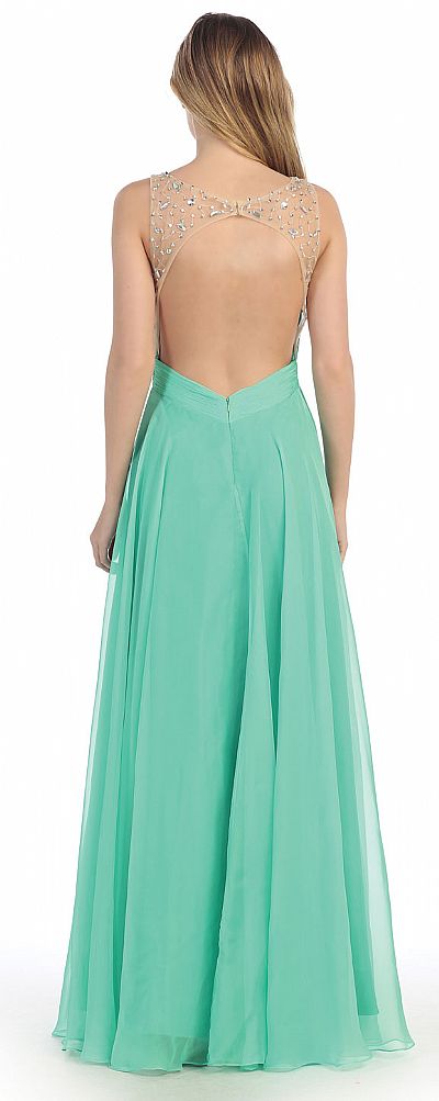 Rhinestones Mesh Bust Long Prom Pageant Dress. Mesh bodice has dense rhinestones at the bust & round neckline with few above the bust & back. Crossed style ruched waistband at front which becomes v-shape at back. A-shape floor length chiffon skirt. Bare back with little mesh with double hook closure. Back zipper closure. Imported.